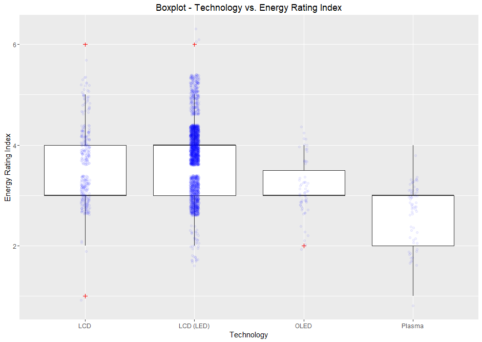 Lastly, the boxplot in [A8] illustrates the different technologies vs. energy rating index. From the plot one can deduce that both LCD and LCD (LED) technologies have, on average, a higher energy rating index and therefore are more energy efficient technologies.