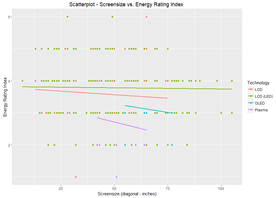 Group based data summarization are listed in [A4] and [A5]. The select function in base R as well as the groupby and arrange functions from the dplyr library were used to filter, group and arrange the dataset in these summarizations. Lastly, ggplot was used to create visual presentations (scatter plots, box plot and line plots) of the following variables: Screen size vs. Active Power, Screen size vs. Energy Rating Index and Technology vs. Energy Rating Index. The scatterplots were overlaid with line plots, which were derived as linear regression models. The lm function in base R was utilized for the regression models.