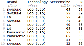 The heatmaps for the dataset [A3] illustrates some interesting clusters and probably coincide with the different technologies and screen sizes. The group-based summarization in [A4] indicates that the 55-inch screen size was the top screen size registered with a total of 539. Interestingly, the 65-inch screen size was the third most registered screen size after the 32-inch. Due to the popularity of the 65-inch screen size one would think that the 60-inch screen size should be equally sought after but, the 60-inch screen size appliances ranks only 8th with a total of 109 appliances registered. The group-based summarization in [A5] indicates that the LCD (LED) is overwhelmingly popular as a technology with Samsung and LG dominating the registration list with their 55-inch, 32-inch and 65-inch LCD (LED) appliances.
