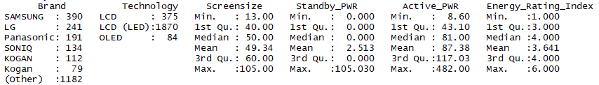 The R-Studio software application (Version: 1.1.383) was used to download and process the television appliance dataset. Functions from the cluster, tidyverse and dplyr libraries were utilized to explore, analyze, evaluate, filter, tidy, transform, summarize and visualize the dataset. Of the 31 available variables only 6 variables, as listed in [A1] (4 of type Numerical and 2 of type Categoric - Nominal), were deemed necessary for the analysis process. The rest of the variables were discarded. The screen size variable was converted from centimeters (as measured diagonally) to inches - this falls more in line with consumer understanding of television screen sizes. The technology variable has 4 possible values: Plasma, LCD, LCD (LED) and OLED. These values are treated as nominal. The SRI (Star Rating Index) variable was rescaled to a value in the range [1:6], which corresponds to the consumer industry star rating standard. Unnecessarily long brand names were shortened to be better displayed in ggplot2 visualizations. All records containing empty values were discarded. The numeric variables Active Power and Standby Power were rounded to two decimal points. A total of 3115 records remained after the original dataset was filtered and missing value records were imputed. See A – R Code for associated R code listings.