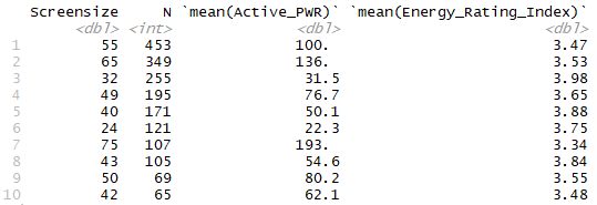Group based data summarization are listed in [A4] and [A5]. The select function in base R as well as the groupby and arrange functions from the dplyr library were used to filter, group and arrange the dataset in these summarizations. Lastly, ggplot was used to create visual presentations (scatter plots, box plot and line plots) of the following variables: Screen size vs. Active Power, Screen size vs. Energy Rating Index and Technology vs. Energy Rating Index. The scatterplots were overlaid with line plots, which were derived as linear regression models. The lm function in base R was utilized for the regression models.