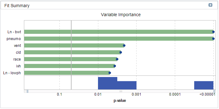 SAS VA managed to successfully fit the logistic regression model, as described in the Methods section, to the VERYLOWBIRTHWEIGHT dataset. SAS VA utilized all 671 observations in the dataset. All predictor variables presenting a p-value > 5% were removed from the model. This left only 7 predictor variables, which in turn contributed to describing 46.2% of the variance in the dataset (R-Squared = 0.4626). The decision to drop the additional predictor variables (variables with p-values > 5%) came at a moderate cost – it caused the model’s R-Squared value to drop from 0.5260 to 0.4626. This, however, is seen as favourable as the parsimonious model is much easier to interpret and presents deeper insight into the predictor variables that contribute most to the model. From a bias-variance trade-off point of view, by dropping redundant predictor variables, we lower the model’s variance at the cost of a small amount of increased bias. Also, by dropping unwanted predictor variables we lower the risk of overfitting the model. The Fit Summary in Figure 1 lists the predictor variables that are statistically significant and therefore are included in the logistic regression model.