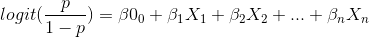 as modelled on the Sigmoid function and where β0 + β1X1 + β2X2 + … + βnXn. To calculate the probabilities from the sigmoid function we take the logit of the odds as follows (after some elementary algebraic manipulation):